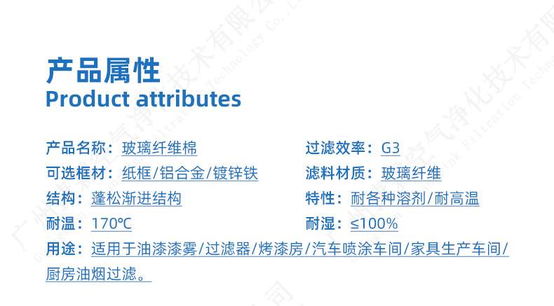 ?采用玻璃纖維以非織物方式制成,透風量大,其空氣阻力小,對漆霧Over-spray捕塵效率佳,使用時間長。